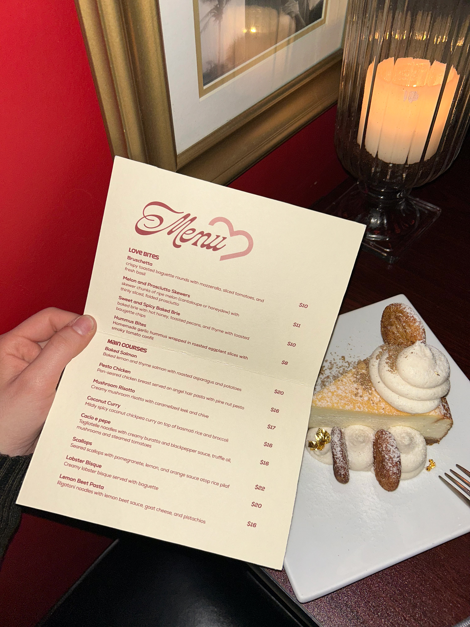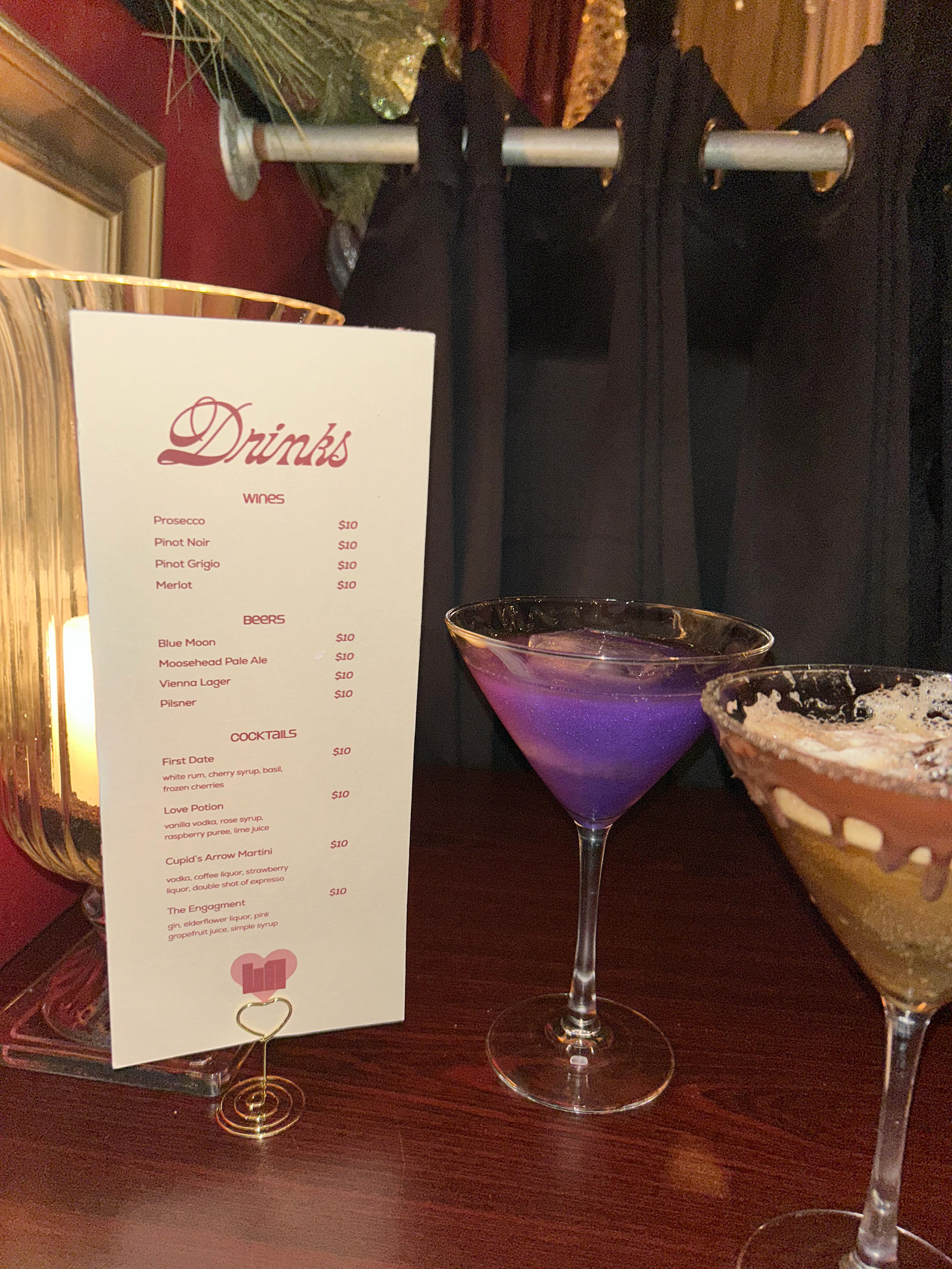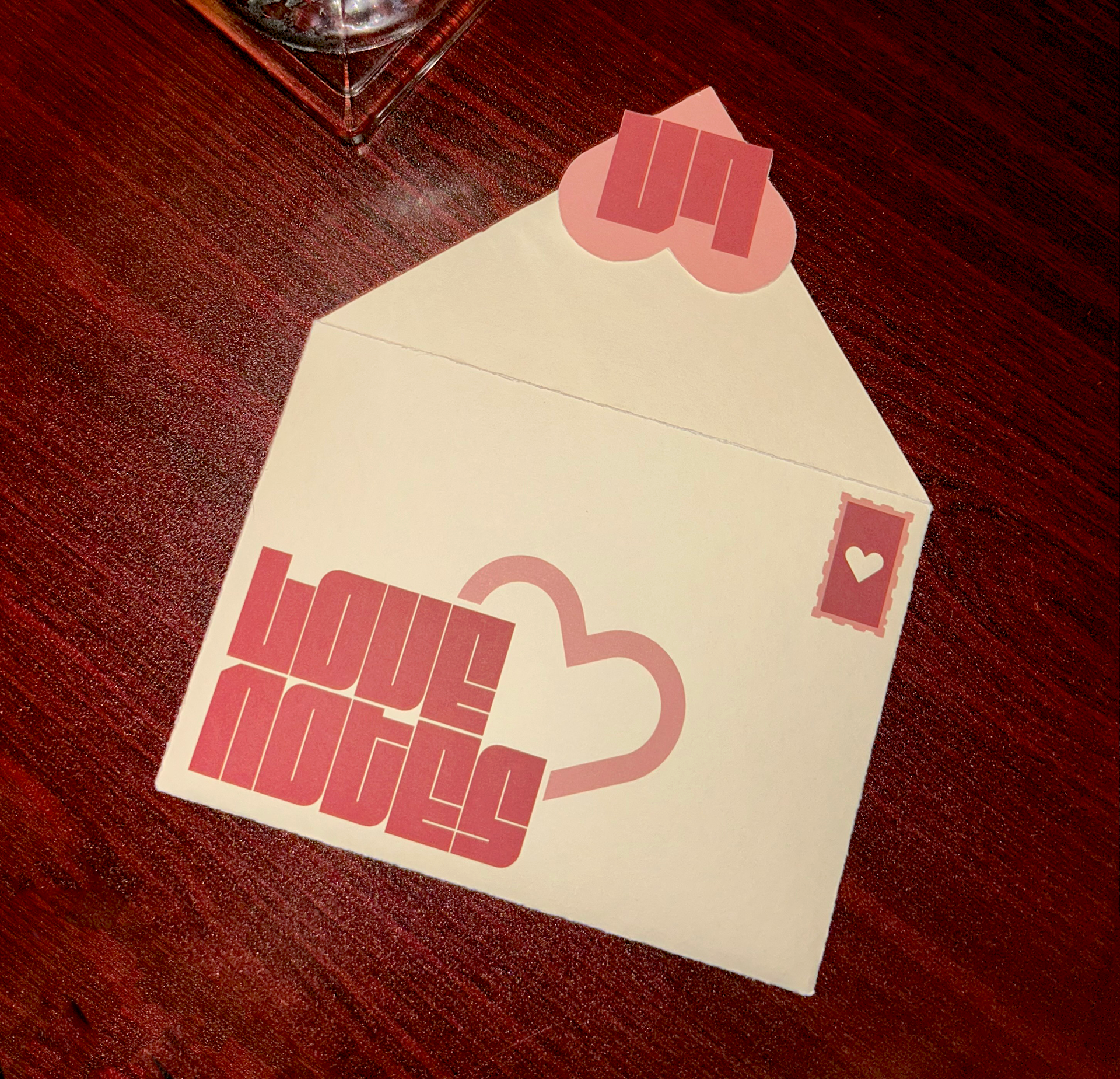 The main courses menu comes in a love-letter inspired envelope that is closed with a sticker of the lovenotes secondary logo. The idea behind this experience is that the resturant is treating each couple special by leaving a love note at the table when they are seated. The drinks menu is provided by a heart shaped stand that matches the logo, and the desserts menu is provided upon request.