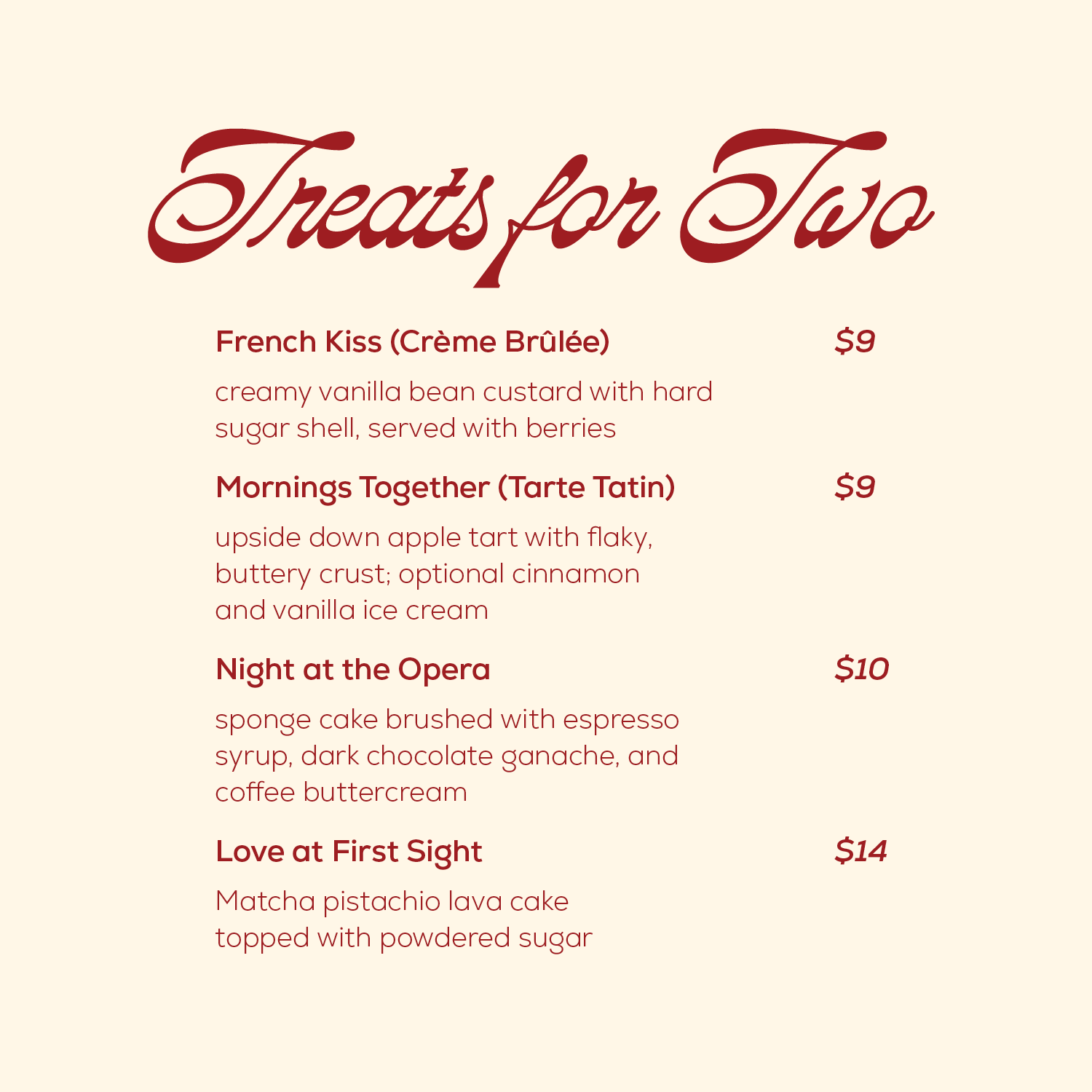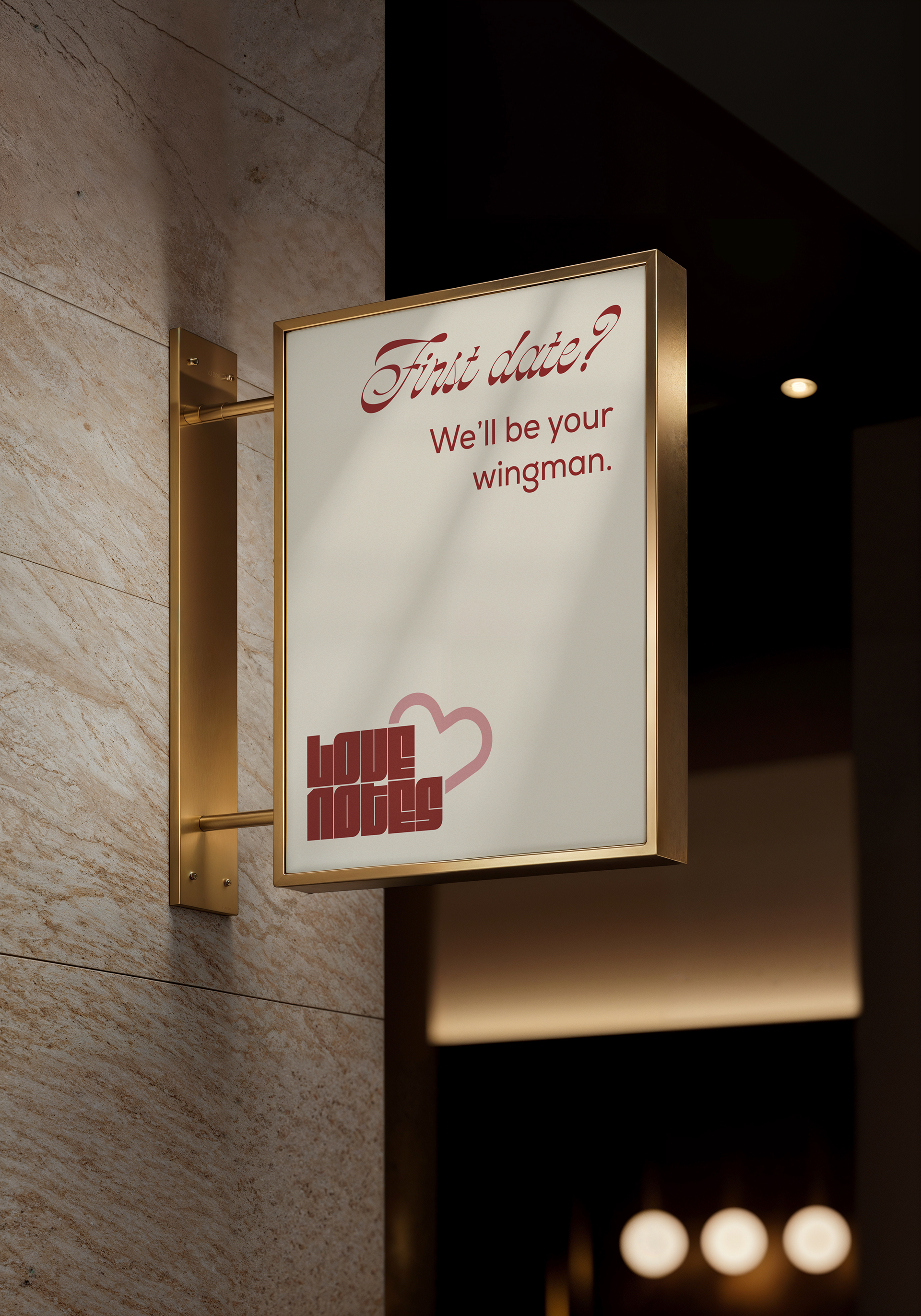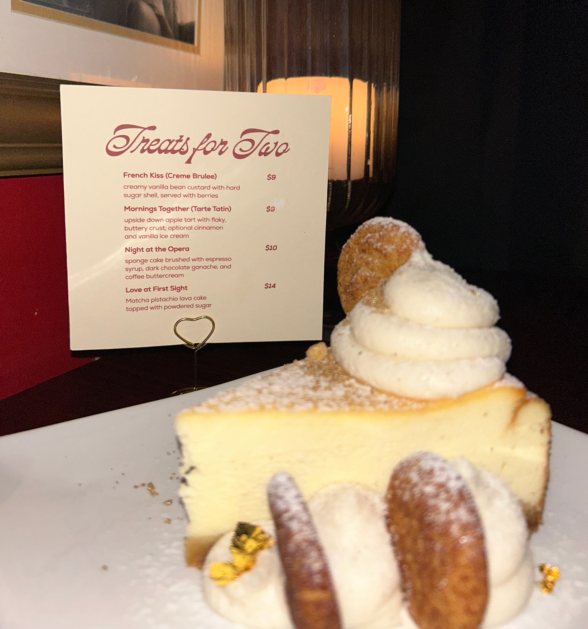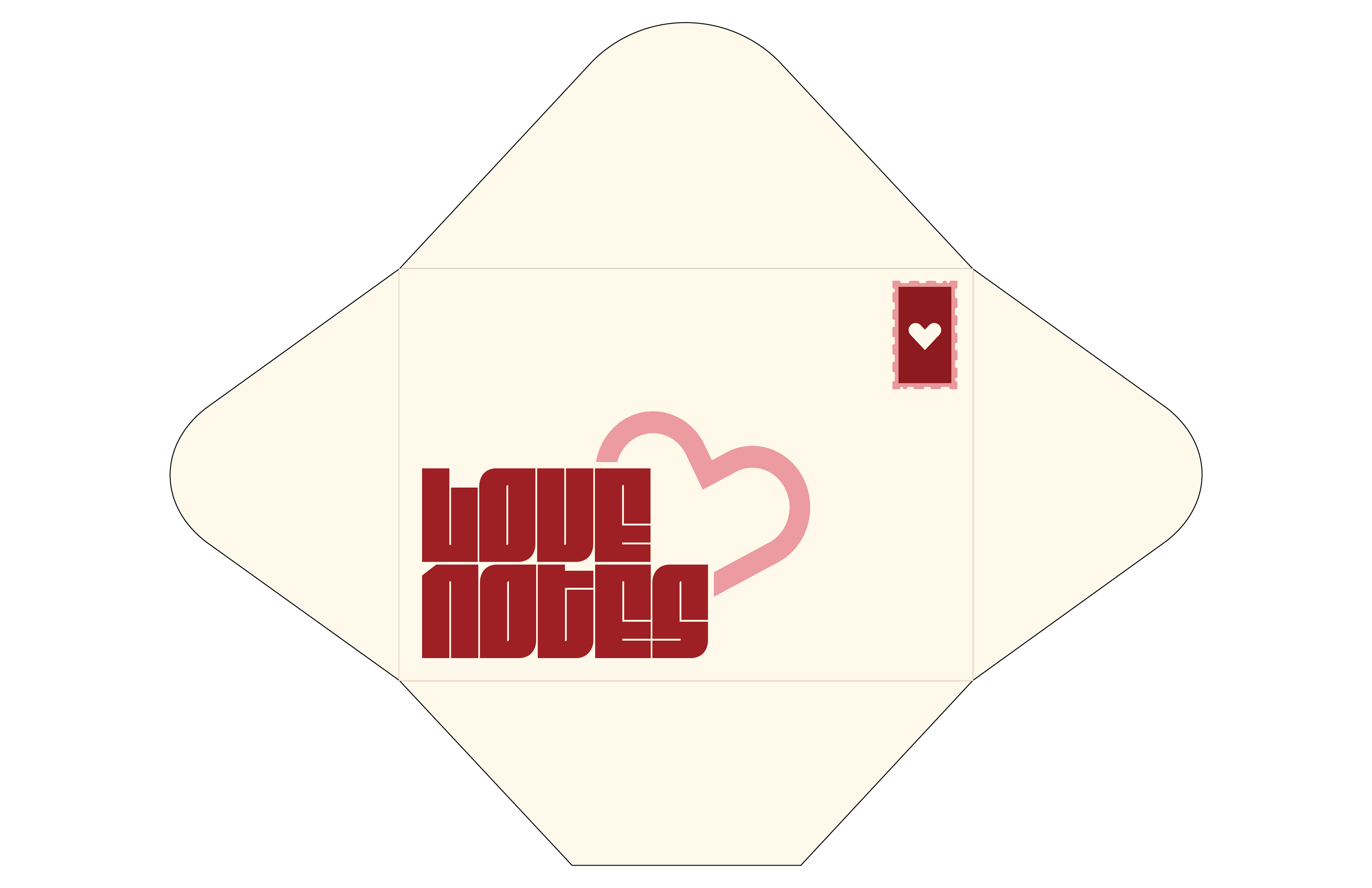 The main courses menu comes in a love-letter inspired envelope that is closed with a sticker of the lovenotes secondary logo. The idea behind this experience is that the resturant is treating each couple special by leaving a love note at the table when they are seated. The drinks menu is provided by a heart shaped stand that matches the logo, and the desserts menu is provided upon request.