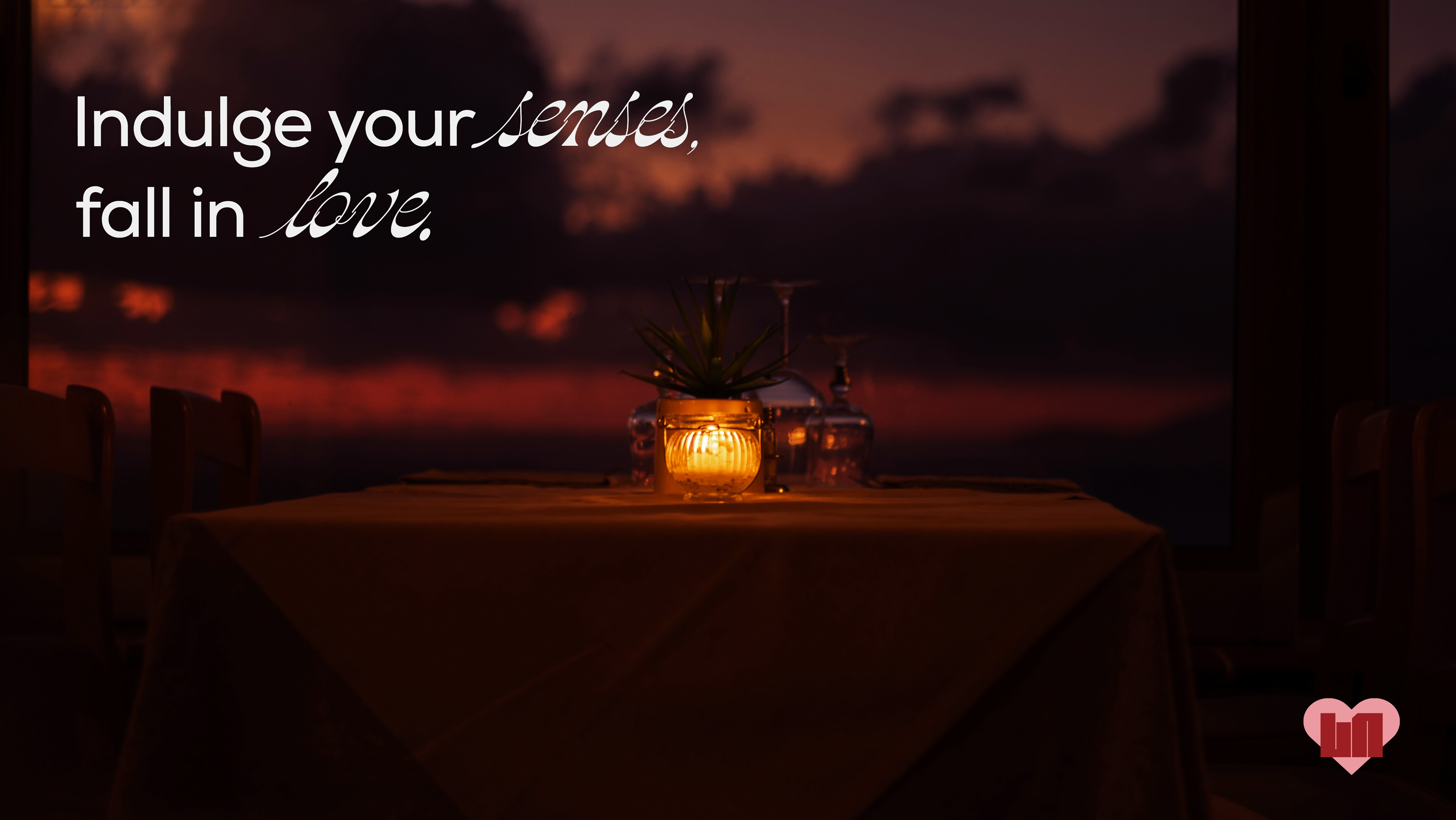 The open and closed stylized heart symbolizes love and connection, which is central to a romantic dining experience. Its modern, geometric design keeps the logo fresh and appealing to a youthful demographic. The heart partially overlapping the text gives a sense of interaction and dynamism, suggesting that this is not just a formal dining brand but one that’s fun, lively, and ideal for young couples or friends celebrating together.